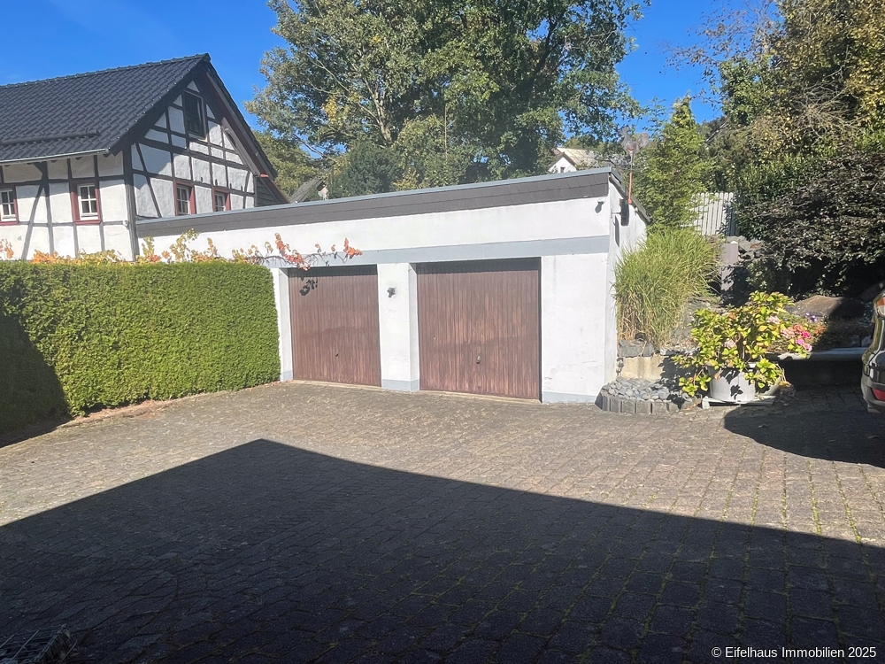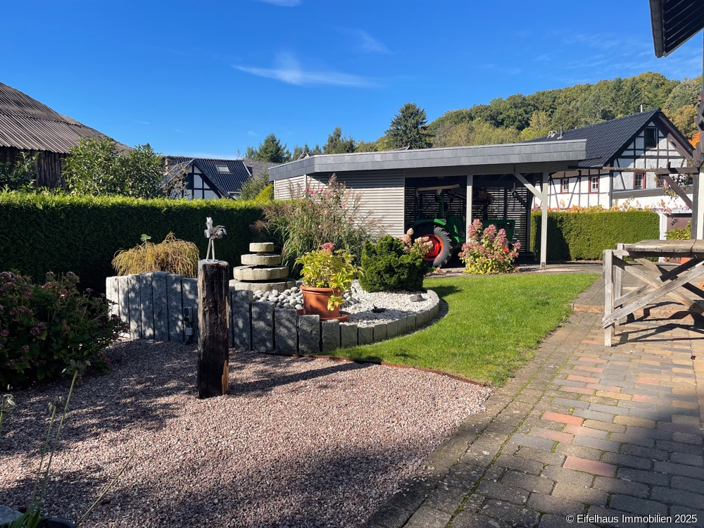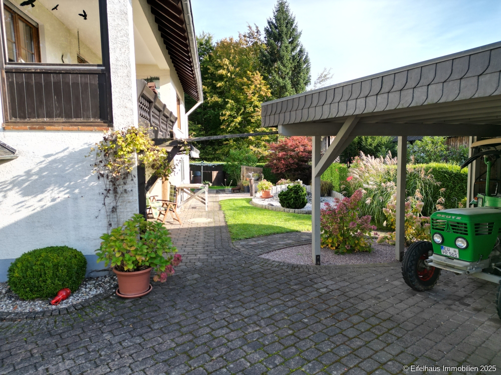 Zur Immobilie gehören eine massive Doppelgarage mit Stromanschluss und Betonboden, ein Carport (Baujahr ca. 2015/16) in Holzkonstruktion mit Stromanschluss sowie großzügig gepflasterte Hofflächen. Ergänzt wird das Anwesen durch einen geschotterten Bodenbereich und einen gepflegten Garten, der das Gesamtbild harmonisch abrundet.