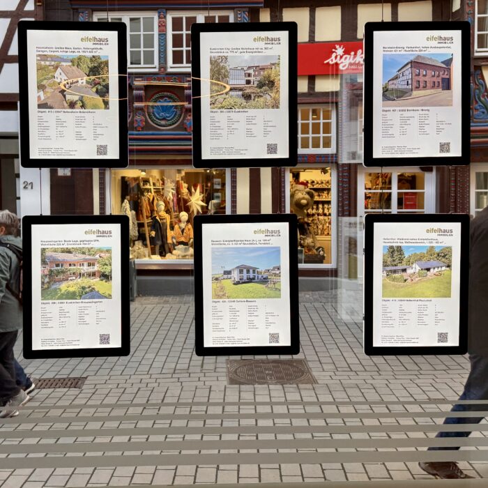 Seit Beginn des Jahres begrüßen wir Sie zusätzlich in unserem Beratungsbüro in der Orchheimer Straße in Bad Münstereifel. Das repräsentative Schaufenster mit einer Galerie aktueller Immobilienangebote macht unser Angebot vor Ort sichtbar und schafft einen direkten, persönlichen Anlaufpunkt für Eigentümer, Kaufinteressenten und Investoren. Mit diesem Schritt möchten wir noch näher an unseren Kunden sein und den persönlichen Austausch weiter stärken.